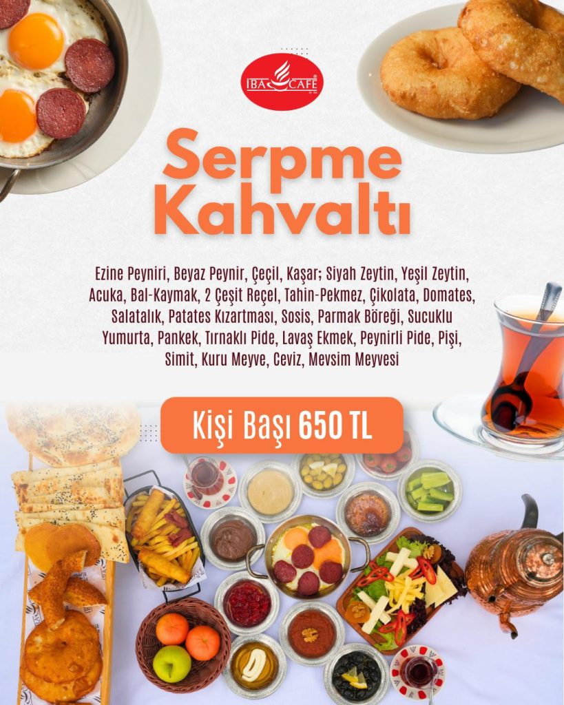 ”Ezine peyniri, kaşar peyniri, çeçil peyniri, beyaz peynir, siyah zeytin, yeşil zeytin, tahin & pekmez, bal & kaymak, kayısı reçeli, vişne reçeli, çikolata, sahanda sucuklu yumurta,kuru meyve, ceviz, acuka, pişi, patates kızartması, sosis, parmak böreği, simit, pankek,tırnaklı pide, lavaş ekmek, peynirli pide, domates, salatalık, ve meysim meyveleri. ”