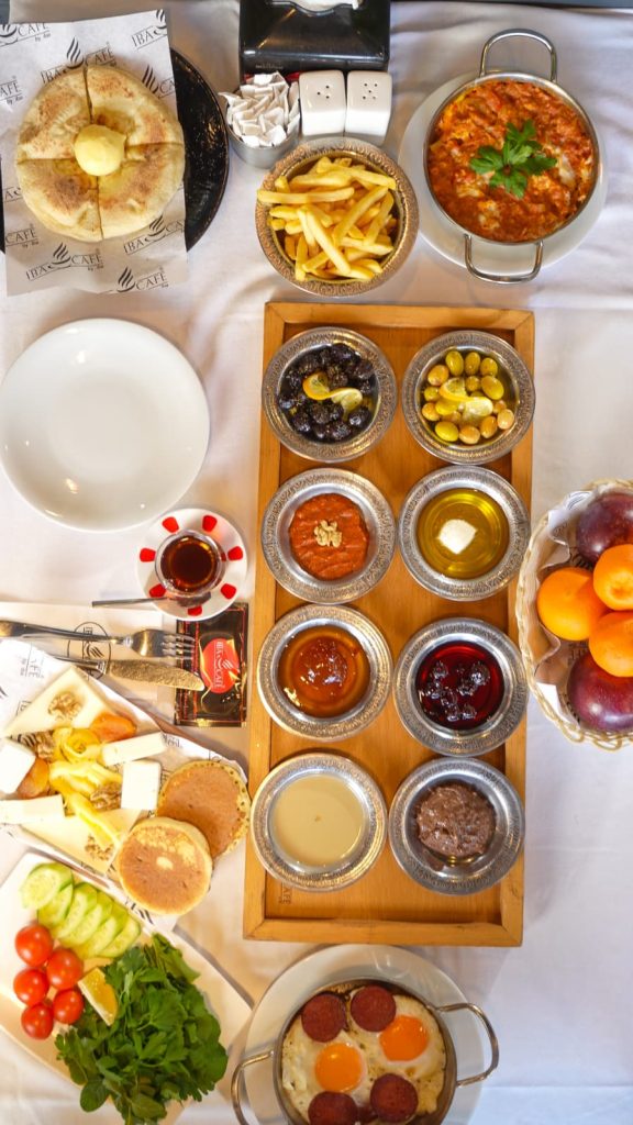 KAHVALTI TABAĞI “Bal, tereyağı, çikolata, yeşil zeytin, siyah zeytin, peynir çeşitleri, domates, salatalık, meyvsim yeşillikleri, patates kızartması, sosis, pişi, haşlanmış yumurta, ve parmak böreği. ” Fiyat:400 TL